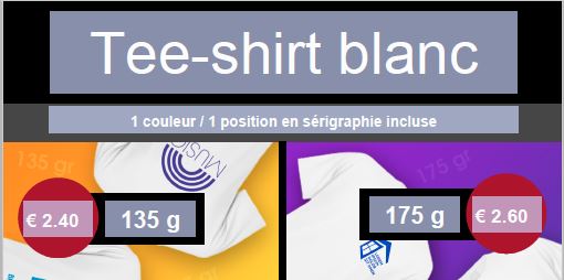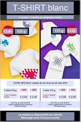 Nous vous proposons ce tee-shirt blanc avec marquage coeur ou dos en 1 ou plusieurs couleurs à un tarif très attractif qui vous permettra de vous démarquer et développer votre activité en étant bien visible.